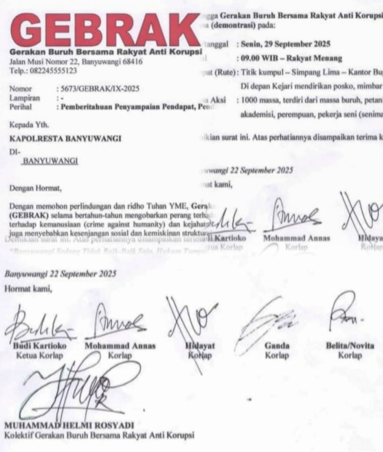 Rencana aksi tersebut diumumkan GEBRAK melalui surat pemberitahuan resmi bernomor 5673/GEBRAK/IX-2025 yang ditujukan kepada Kapolresta Banyuwangi. Massa diperkirakan mencapai 1.000 orang, terdiri dari buruh, mahasiswa, organisasi masyarakat, hingga jurnalis. Titik kumpul akan dimulai di Simpang Lima, lalu bergerak menuju Kantor Bupati, DPRD, hingga Kejaksaan Negeri (Kejari) Banyuwangi.