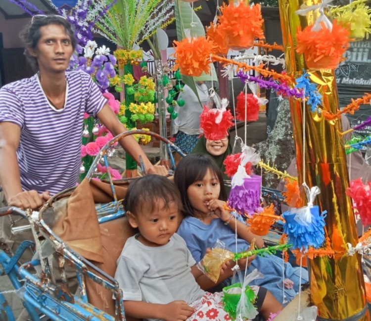 Warga dusun sawaan meramaikan peringatan maulid nabi Muhammad Saw dengan arak-arakan Telur